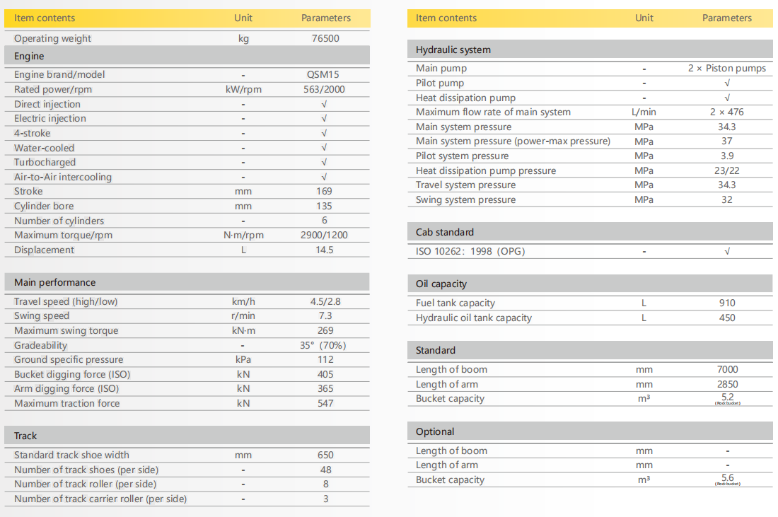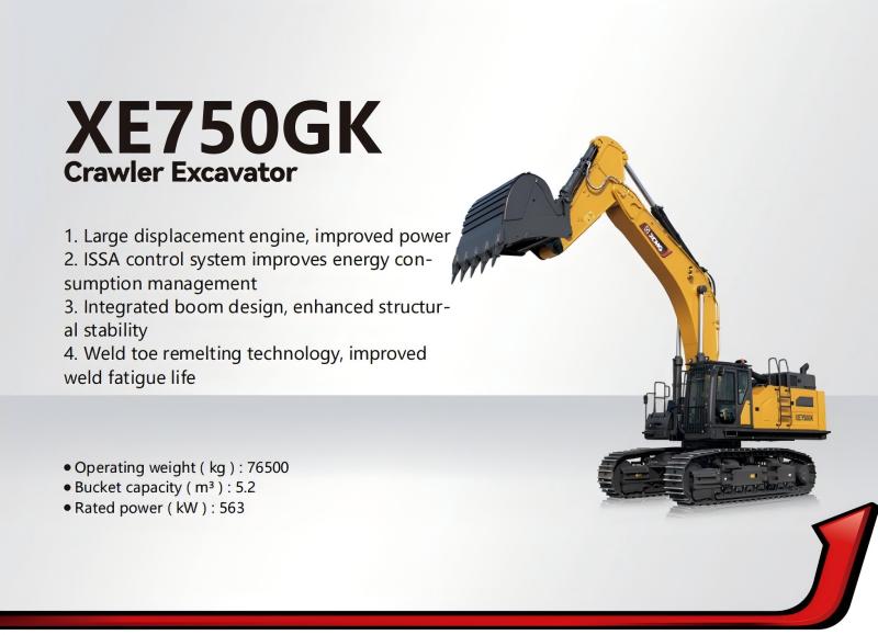 XCMG 76T Large Mining Crawler Excavator XE750GK employs a newly developed power servo technology based on the coordinated response to changes in excavator operating cycle load. It enables precise management of working conditions and excellent fuel economy. Its 90T heavy-duty telescopic undercarriage offers high reliability and stability. The working device features a large-box design, providing strong operational capacity and a long service life. It is widely used in large-scale earthmoving and loading projects in infrastructure, water conservancy, and real estate. As well as sand and gravel stripping and crushing, and stone excavation and loading.
